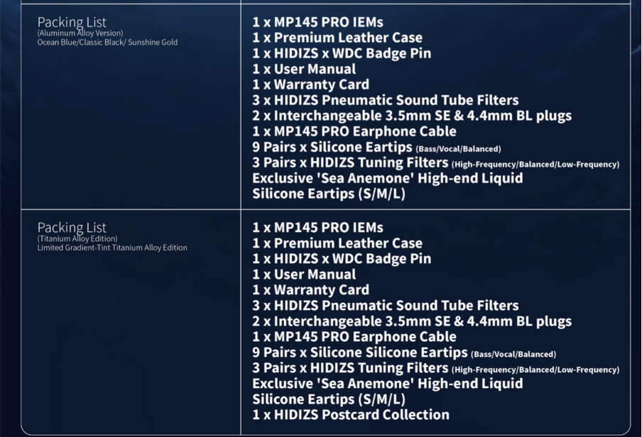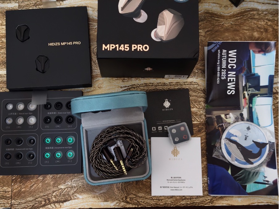 The packaging here is a major step up from the original MP145 and it is the most complete packaging with high quality accessories amongst all the products of Hidizs. Boxed in a solid cube shape box that is slightly large with a WDC 2025 autumn newspaper and a whale pin badge. Inside we are greeted with the MP145 Pro IEM head with 4 types of eartips including the Hidizs Sea Anemone eartips, a high quality leather hardcase in ocean blue, a high quality modular cable and of course, their highly regarded Pneumatic tuning nozzles. I really love the upgraded unboxing experience and the high quality accessories. Here is the full list of the included accessories.