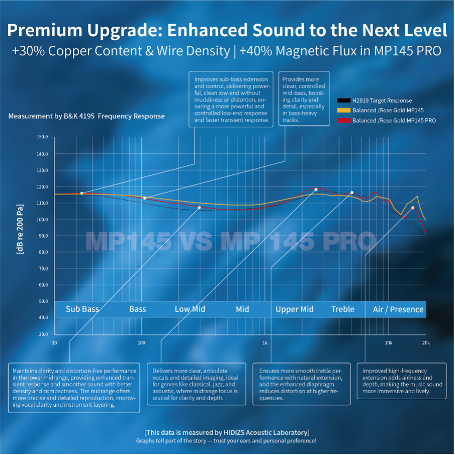 Midrange on the Pro version is slightly thicker and lusher and has better musicalities. Details and clarity are similar but the MP145 sounded slightly cleaner and slightly clearer. There is a bigger lower midrange peak on the Pro version that gives them a deeper sound signature. The Pro version mids have some forwardness to them and they are more slightly more intimate while the MP145 has better spatial accuracy with a more spacious mids.