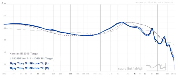 Reaching into the higher frequencies, the Tipsy M1 features a smooth, safe tuning which does also appear to be leaning towards a darker sound signature due to the lack of elevation past 10kHz. Surprisingly, the treble tuning is well-kept under the neutral target although there are peaks and dips within the region. However, it does seem less likely to emit harsh sounds, as the graph looks smooth from end to end. Overall, Tipsy Audio M1 from the graph can be described to have a bassy sound signature with a rich, warmer tonal balance in the lower-mid and a forward upper-mid presentation. Treble on the other hand is in the safe, smooth category with good presence at 4kHz which should provide enough sparkle, although it may sound a bit too dark for some due to the lack of emphasis past 10kHz.